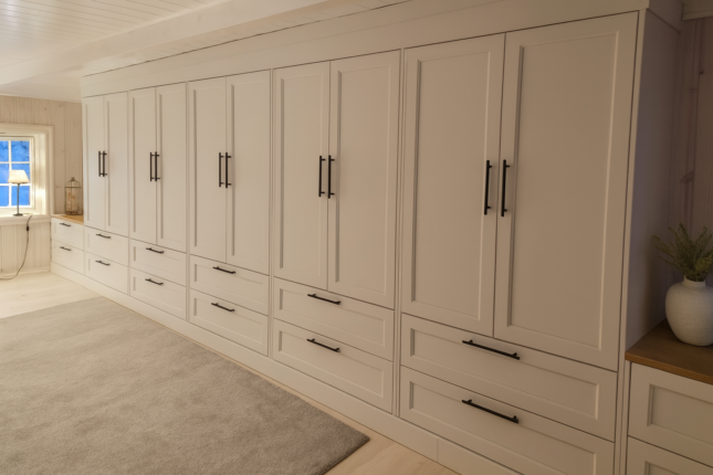 Åsgård 2-dørs garderobe med sittebenk. Spesialbygget til kunde.