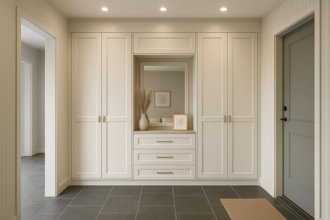 Åsgård 2-dørs garderobe med sittebenk. Spesialbygget til kunde.