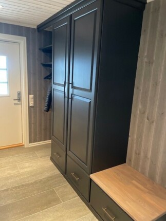 Åsgård 2-dørs garderobe med sittebenk. Spesialbygget til kunde.