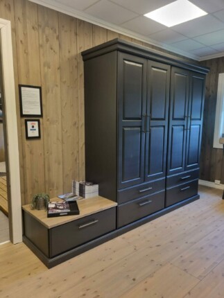 Elvegård garderobeløsning for entre eller soverom. Bygges på mål som frittstående skap, hjørnemontert eller vegg til vegg og gulv til tak. Mulig med skuffer og sittebenk. Fritt fargevalg og en mengde forskjellige håndtak. Skapet er laget i heltre furu med kraftige dempeskinner i skuffer og dempeshengsler i dører. Send oss en mail med målsatt skisse så lager vi ett tilbud tilpasset ditt behov.
