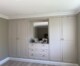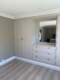 Plassbygd Øygård 2-dørs garderobe, kommode med speil og 2-dørs garderobe. Vegg til vegg og gulv til tak etter kundens mål, design og fargeønske. Her er hele oppsettet listet inn med husets gulv og taklister.