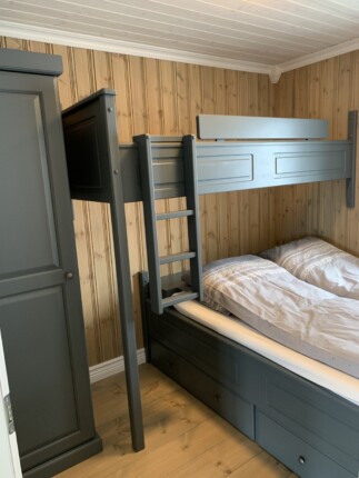 Her har vi plassbygd en dobbeltseng vegg til vegg og montert en køyeseng på tvers over. En smart måte å utnytte rommet på når en vanlig familiekøye vil komme i konflikt med vinduet.