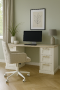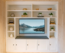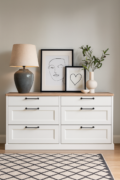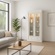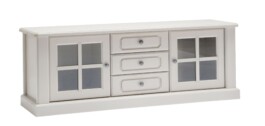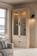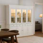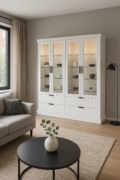 Stort skap med fire dører og skuffer i underdel. Overdel med glasshyller og led-lys. Dempehengsler i alle dører og dempeskinner i skuffene.