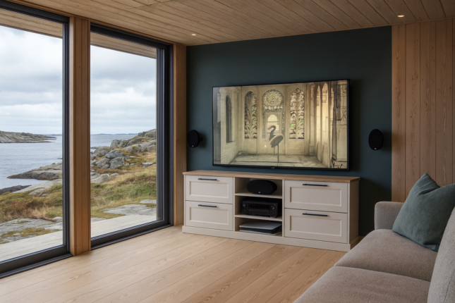 Åsgård tv-bord med 4 skuffer. Egghvit med eikeplate i osmo white.