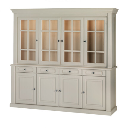 Stort skap med fire dører og skuffer i underdel. Overdel med glasshyller og led-lys. Dempehengsler i alle dører.