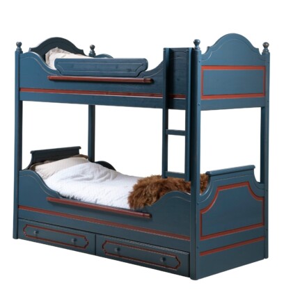 Fjellgård køyeseng avbildet i blå med rød dekor. Køyesengen leveres i 75,80,90 x 200 cm. Høyde 180 cm. (For ytre mål: + 8 cm). Kan leveres i spesiallengder. Skuffer er tilleggsutstyr.