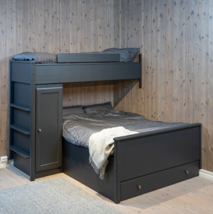 Eksempel på plassbygd hjørnemontert seng 150 og hjørnemontert overkøye 90. Gavelskuff under hovedseng og garderobeskap under overkøye. En god plassutnyttelse og mye lagringsplass. Her avbildet i Dempet sort.